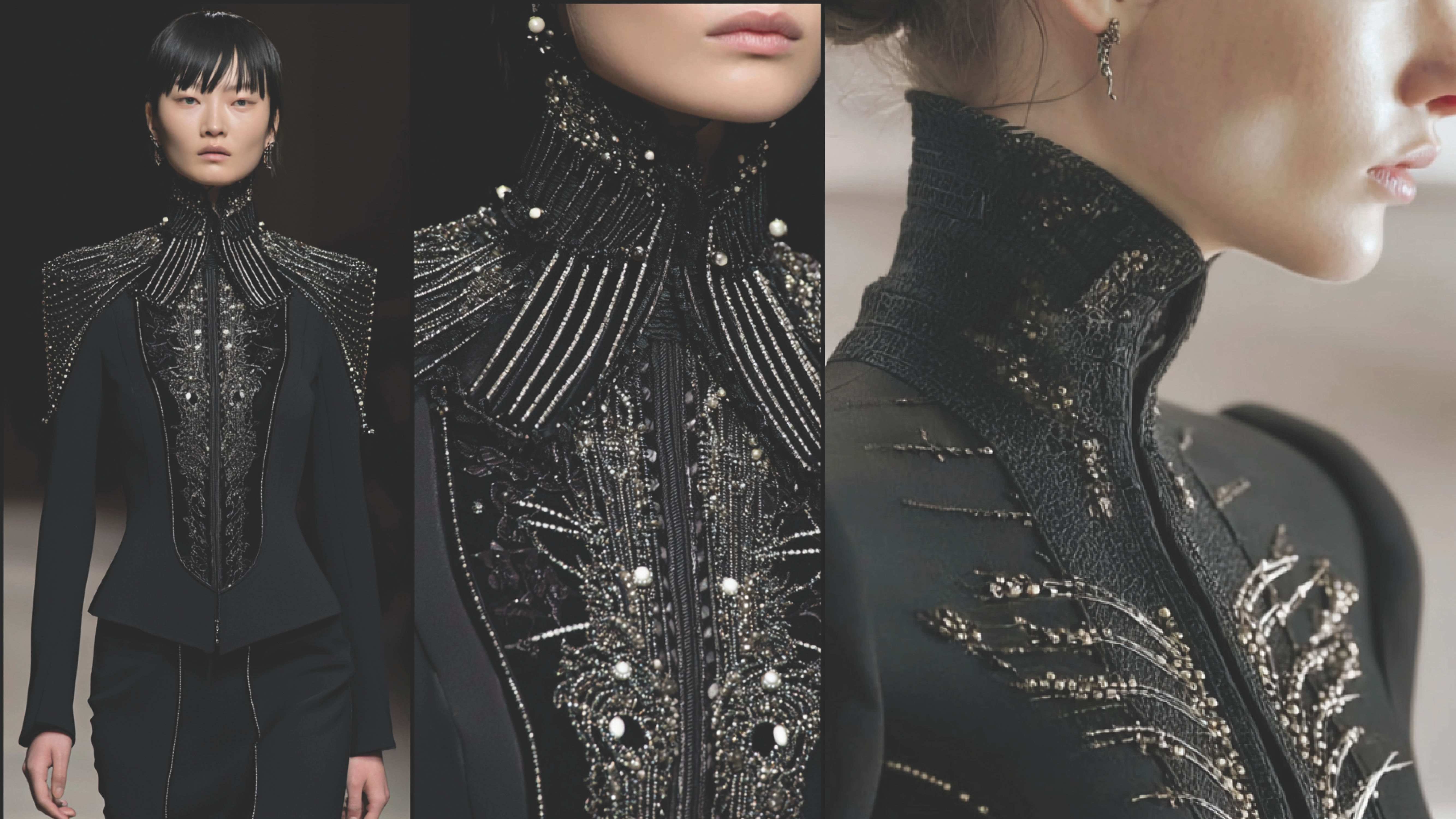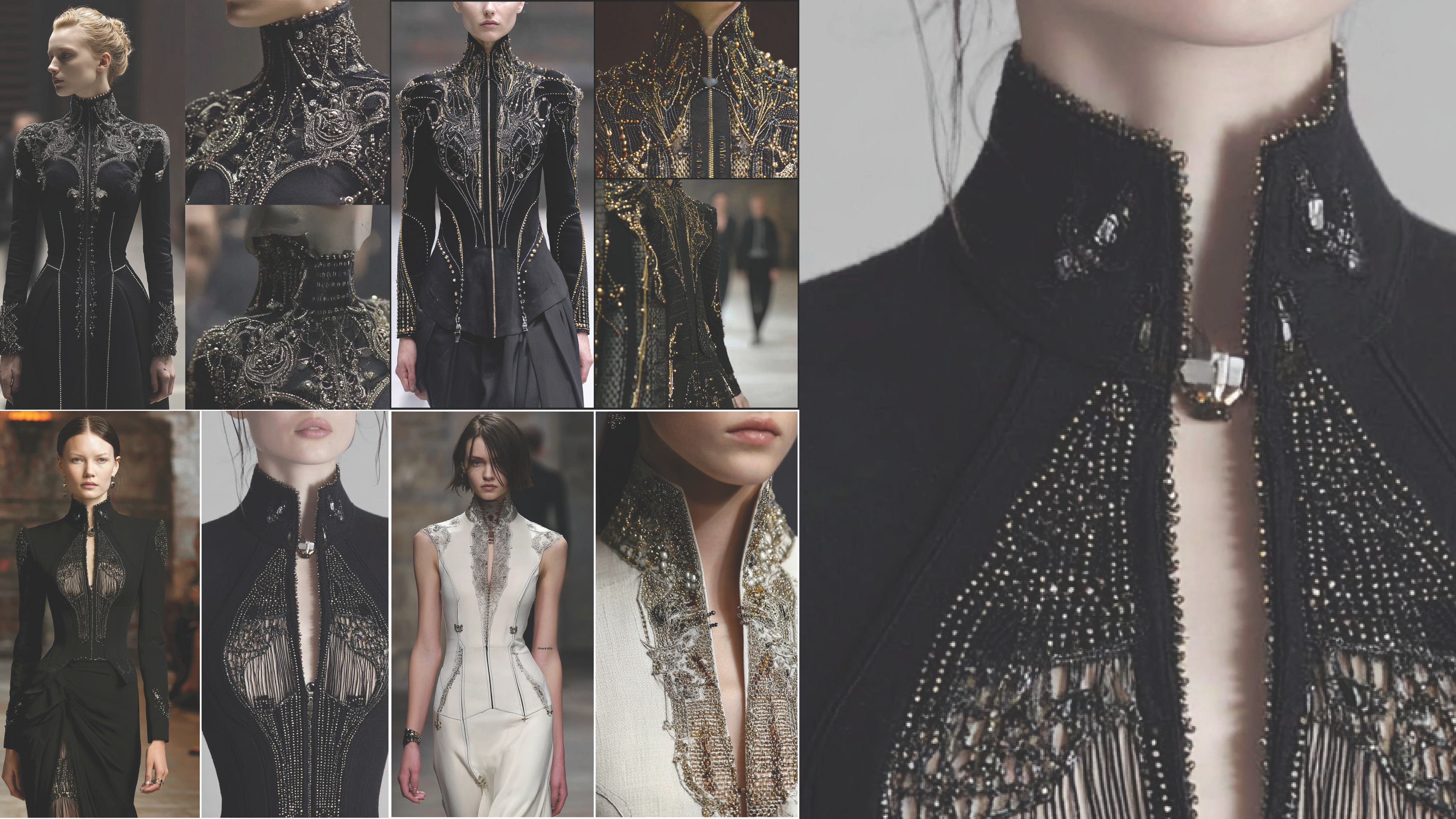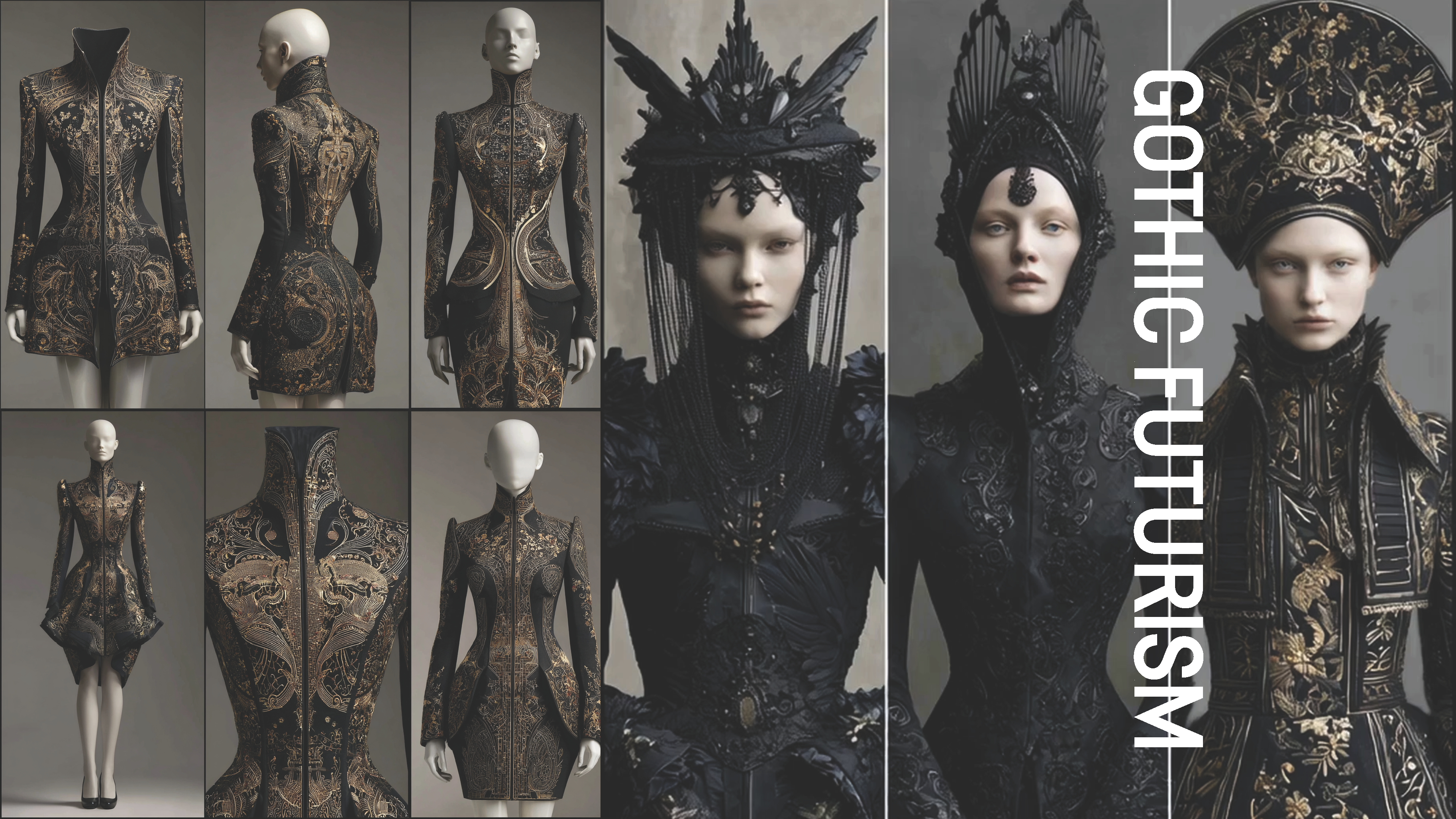 A fusion of gothic regality and futuristic precision, this exploration blends ornate embroidery with biomechanical structure. Each silhouette is engineered like armor—architectural, rigid, and imbued with ritualistic symmetry. The palette and texture language evoke power and transcendence, merging baroque opulence with post-human evolution.