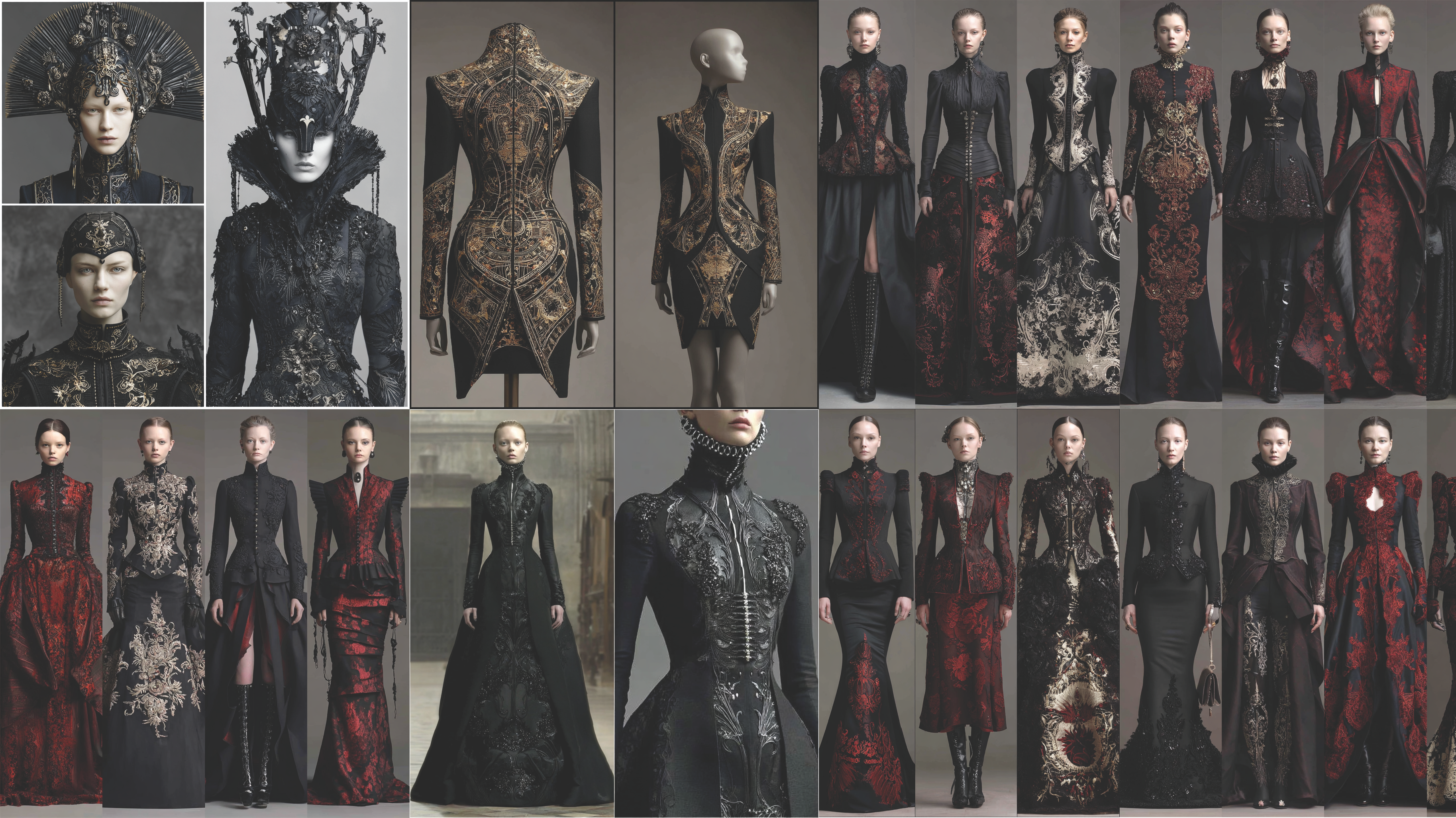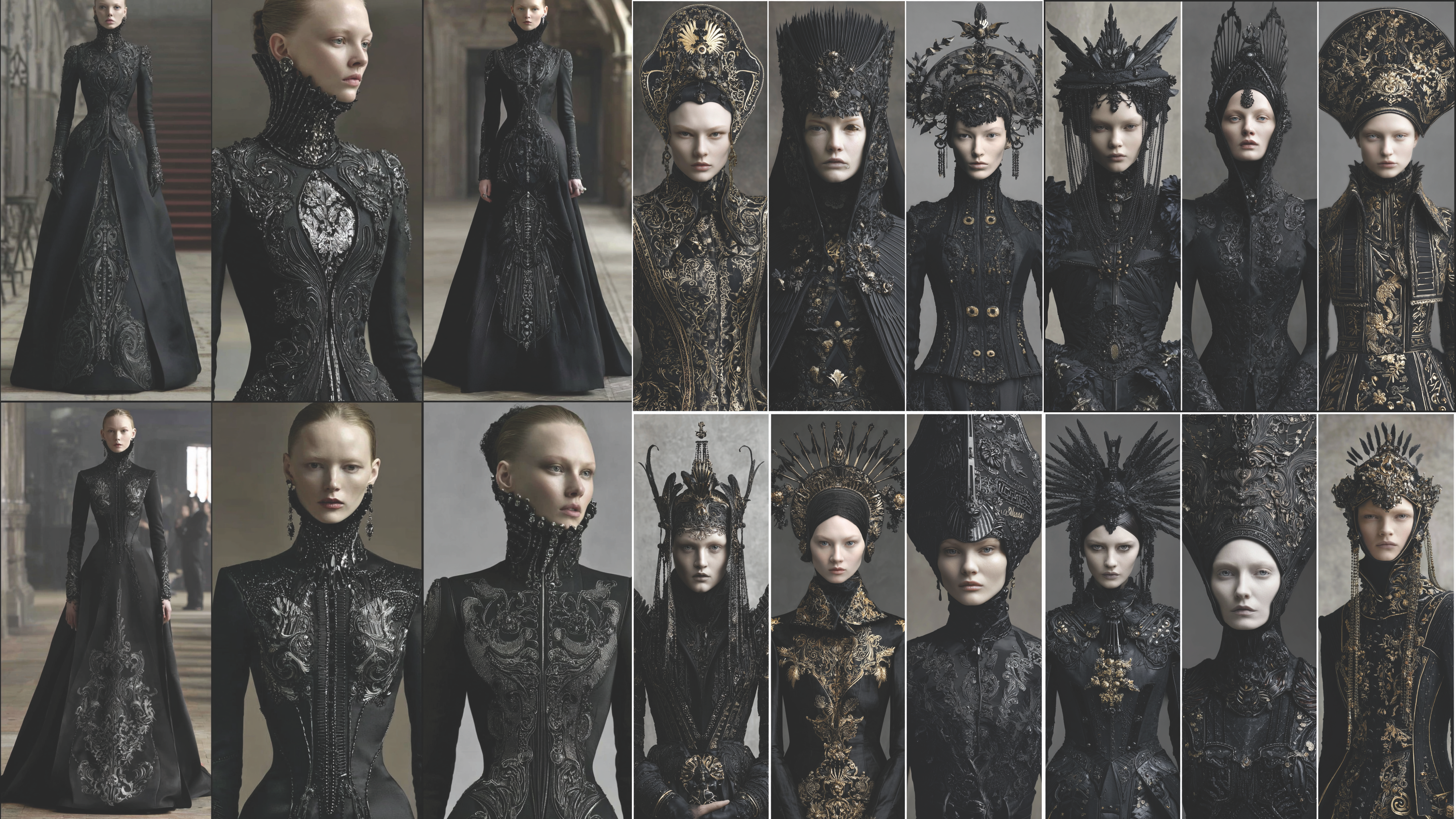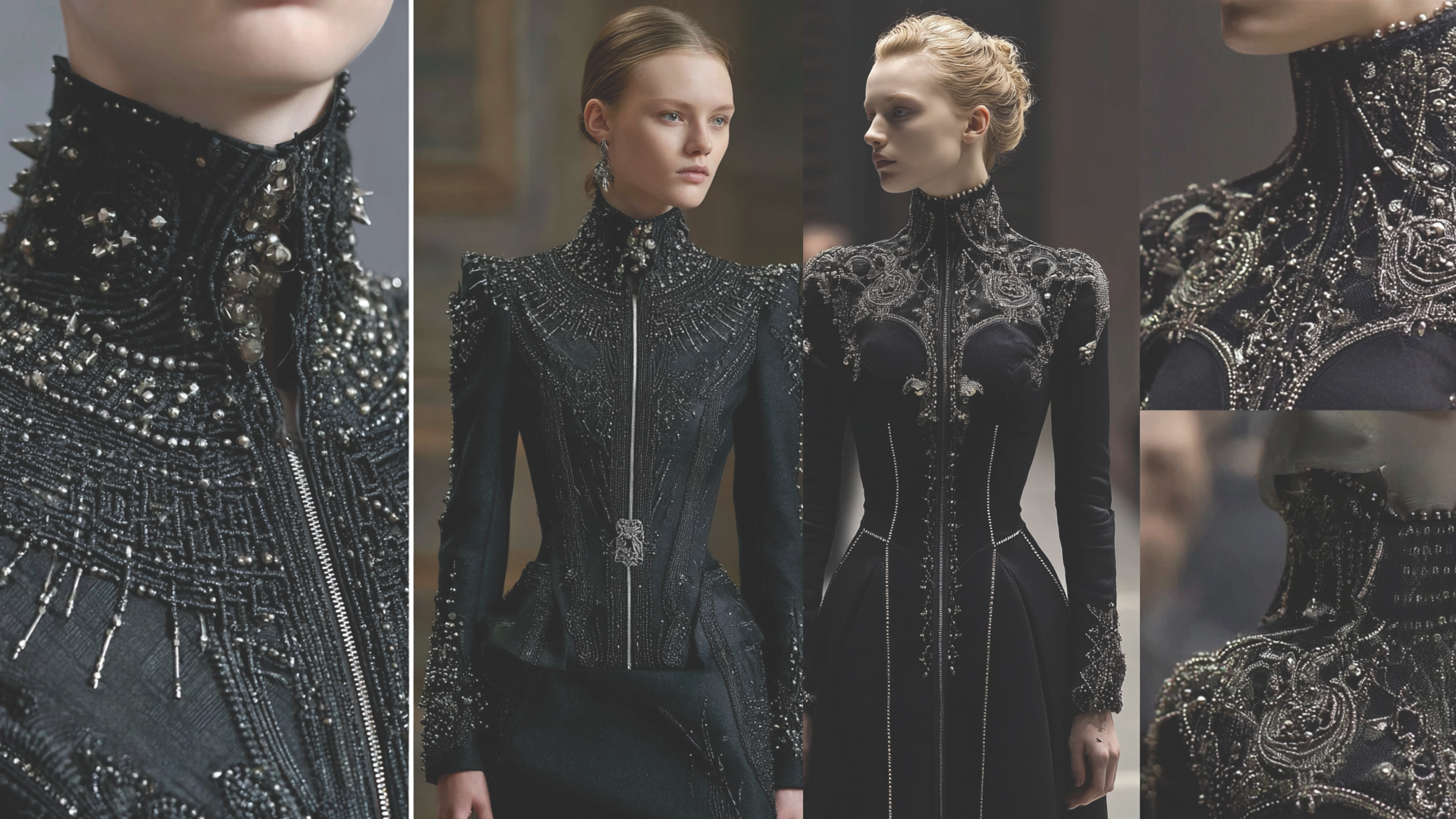 A fusion of gothic regality and futuristic precision, this exploration blends ornate embroidery with biomechanical structure. Each silhouette is engineered like armor—architectural, rigid, and imbued with ritualistic symmetry. The palette and texture language evoke power and transcendence, merging baroque opulence with post-human evolution.